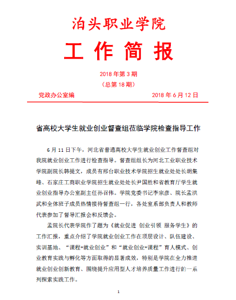 6月11日下午,河北省普通高校大学生就业创业工作督查组对我院就业创业工作进行检查指导。督查组组长为河北工业职业技术学院副院长韩提文,成员有邢台职业技术学院招生就业处处长胡集峰、石家庄工商职业学院招生就业处处长尹国胜和省教育厅学生就业创业指导办公室副主任孙召伟。学院党委书记李宗彦、院长孟洪武和全体班子成员热情接待督查组一行,各处室系部负责人和教师代表参加了督导汇报会和反馈会。