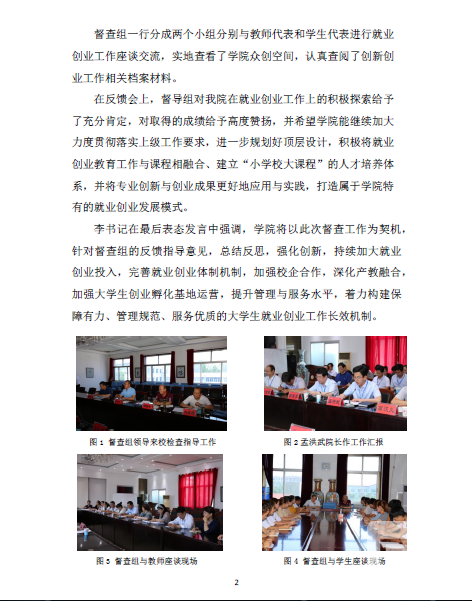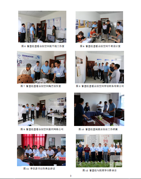 督查组一行分成两个小组分别与教师代表和学生代表进行就业创业工作座谈交流,实地查看了学院众创空间,认真查阅了创新创业工作相关档案材料。